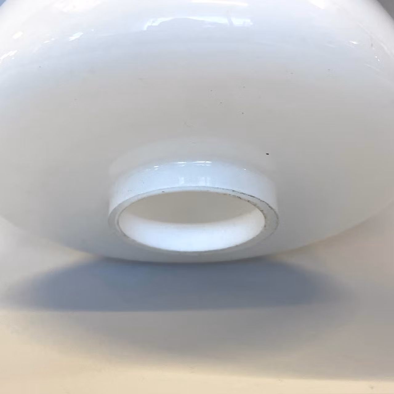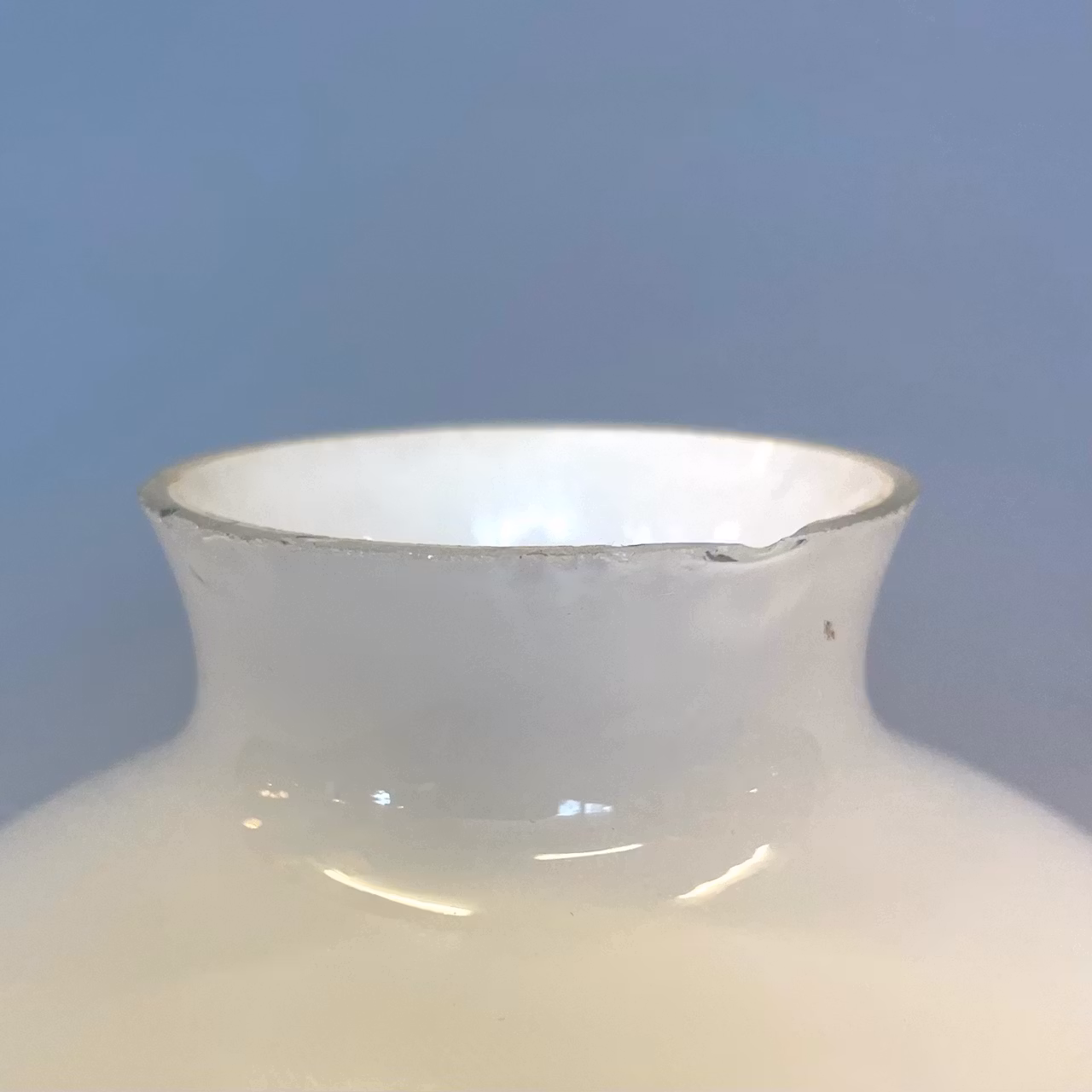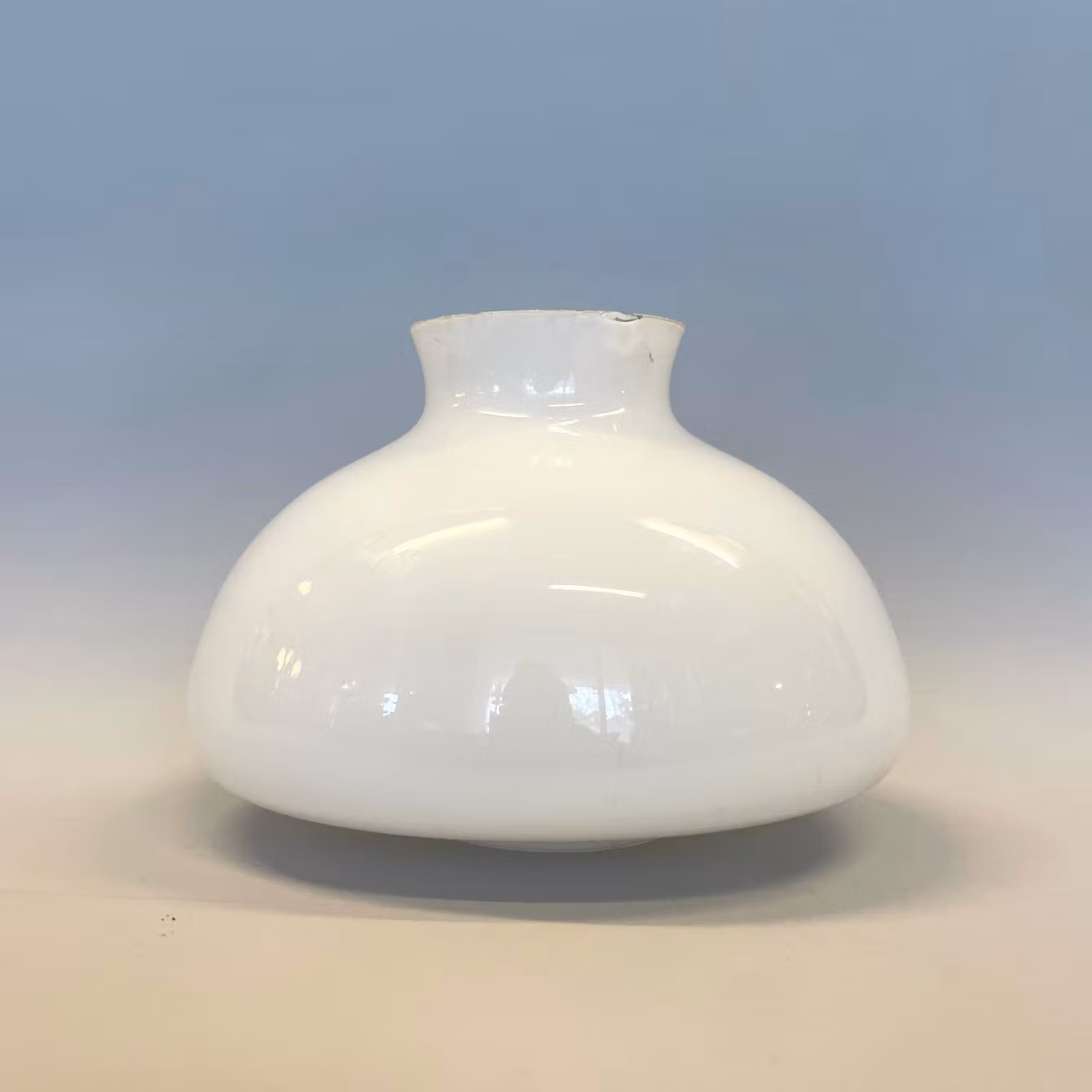 Denna opalvita släta vestaskärm har en nedre fattning på cirka 46 mm i diameter och är således anpassad för skärmringar på minst 50 mm i diameter. Det är en av våra mindre skärmar. OBSERVERA att den är naggad i övre kanten.
